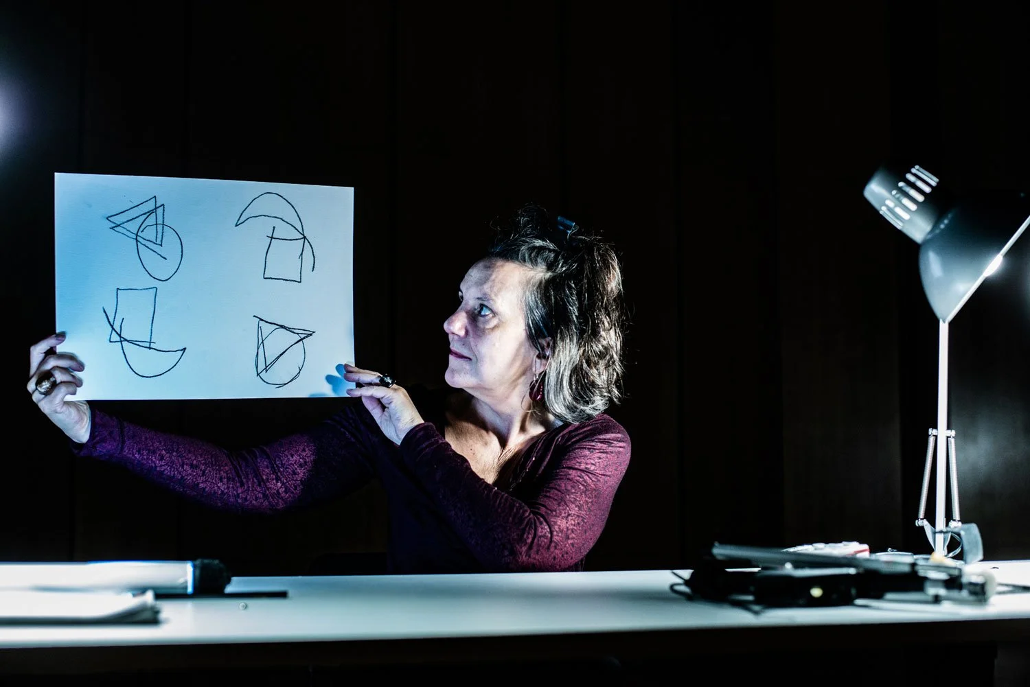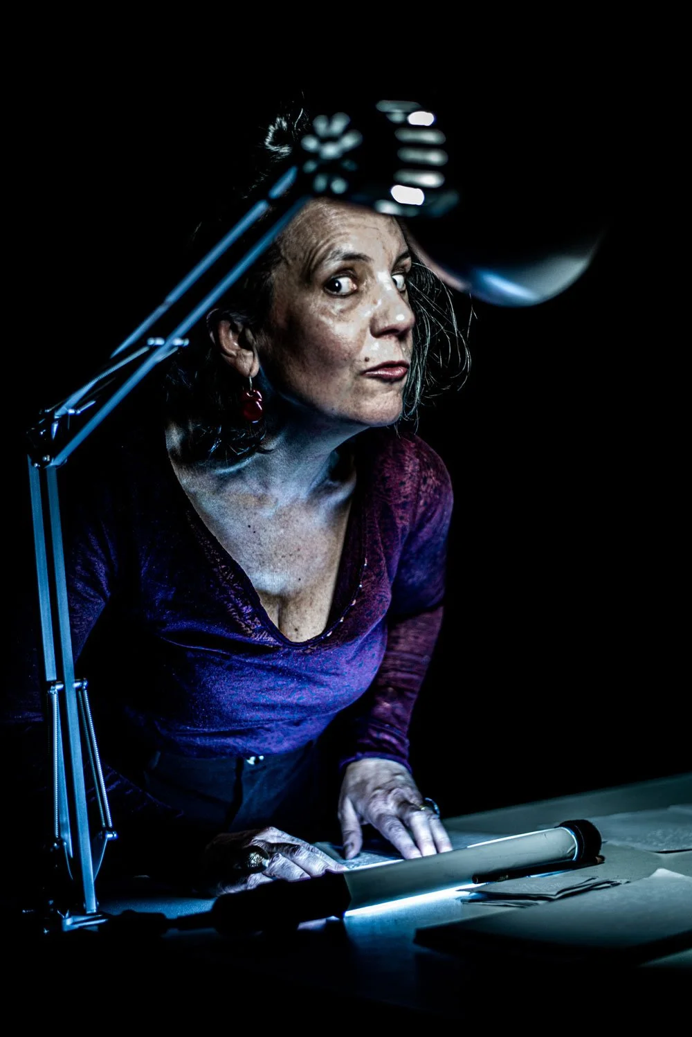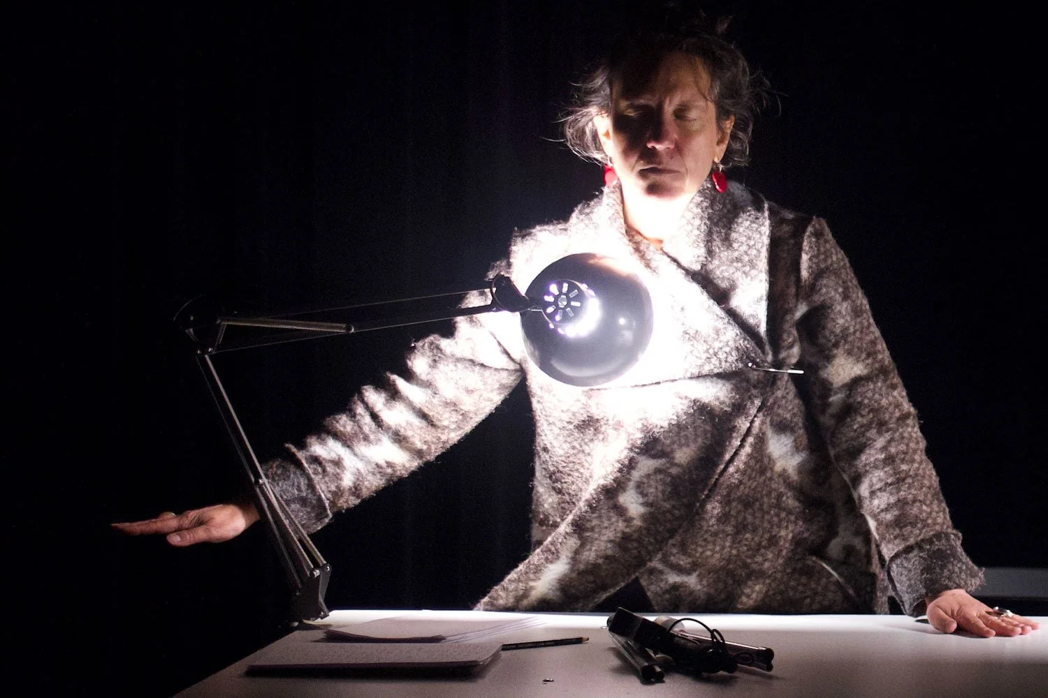 Thierry Grapotte, scénographe, pose la question : « Qu’est-ce que ça signife d’éclairer quelqu’un qui ne voit pas ? » Nathalie n’a pas besoin de lumière. Donc elle sera maître de la lumière et de l’ombre. Thierry fixe trois lampes sur la table, Nathalie allume, oriente, éteint, elle joue à diriger nos perceptions, nous qui voyons et qui la regardons. Le regard circule sans arrêt du plateau à la salle. Elle nous plonge dans le noir, ça ne change rien pour elle, pour nous ça change tout, elle ne parle plus, elle nous écoute nous perdre dans le noir.