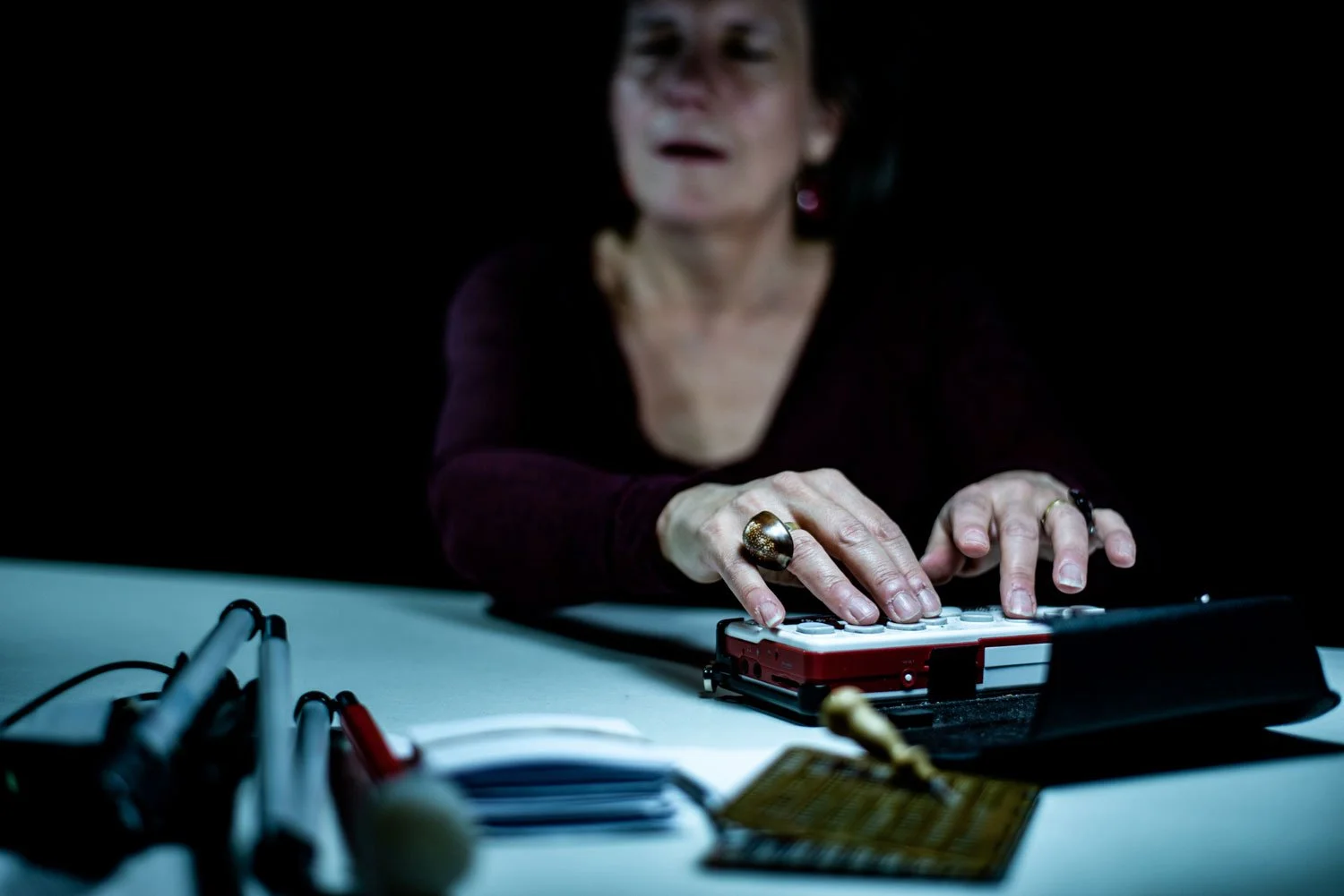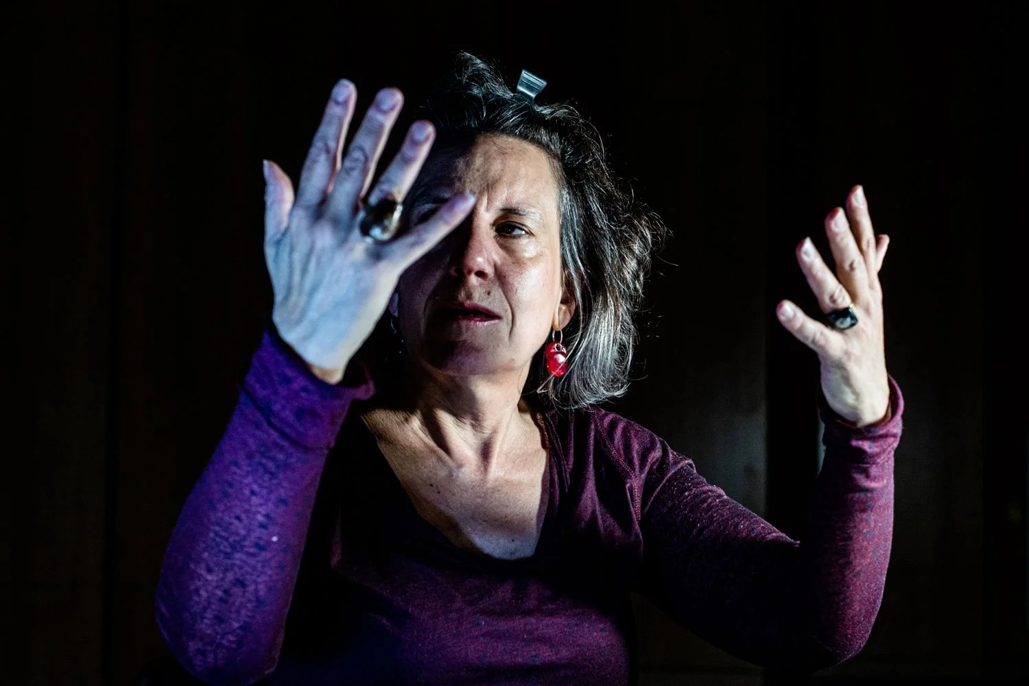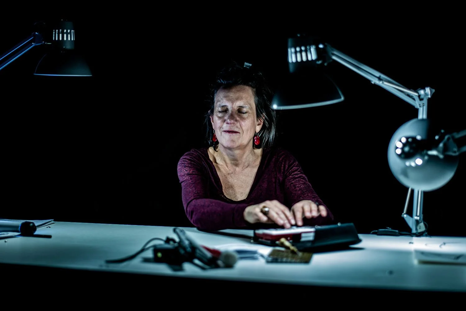 Thierry Grapotte, scénographe, pose la question : « Qu’est-ce que ça signife d’éclairer quelqu’un qui ne voit pas ? » Nathalie n’a pas besoin de lumière. Donc elle sera maître de la lumière et de l’ombre. Thierry fixe trois lampes sur la table, Nathalie allume, oriente, éteint, elle joue à diriger nos perceptions, nous qui voyons et qui la regardons. Le regard circule sans arrêt du plateau à la salle. Elle nous plonge dans le noir, ça ne change rien pour elle, pour nous ça change tout, elle ne parle plus, elle nous écoute nous perdre dans le noir.